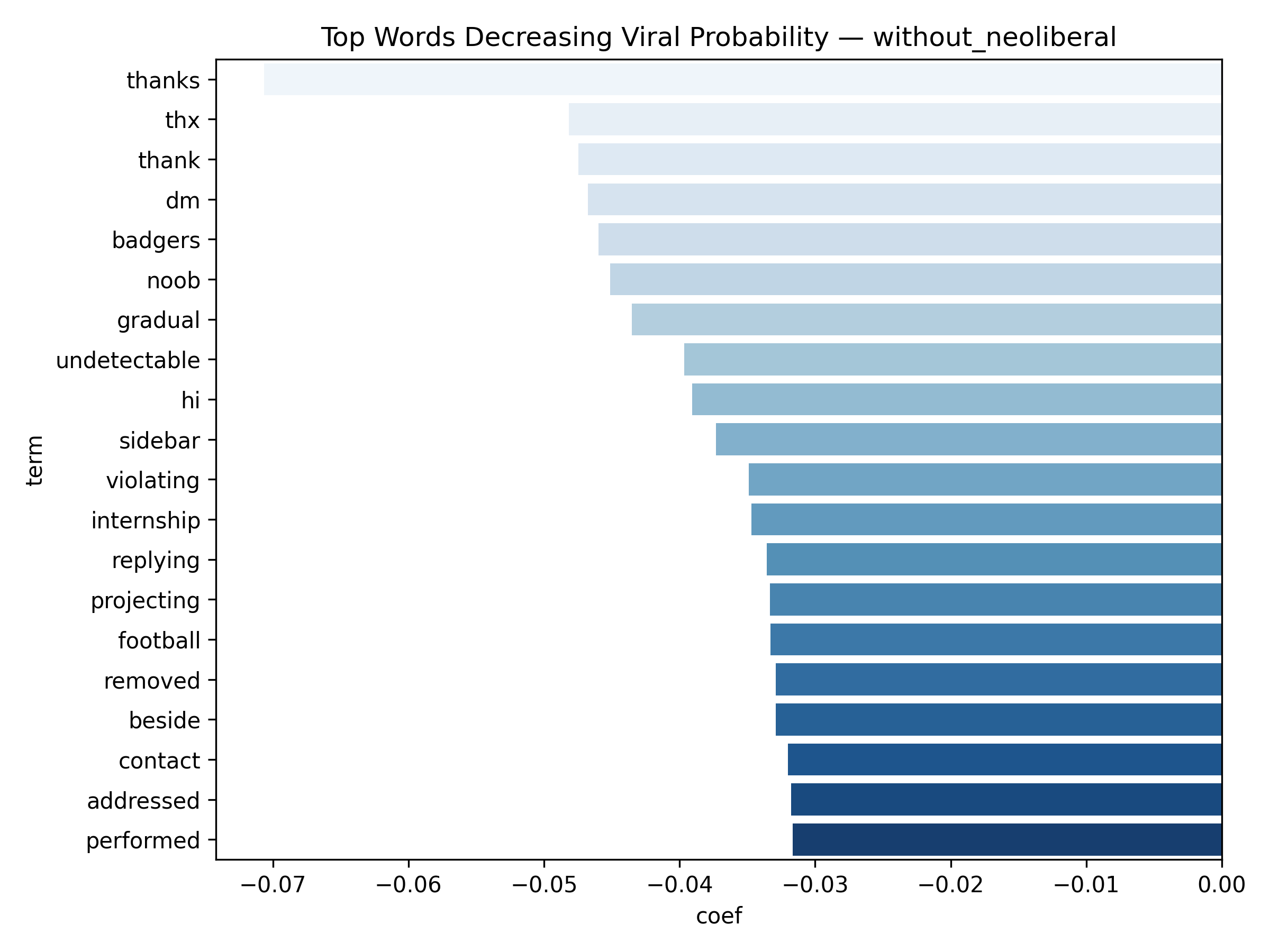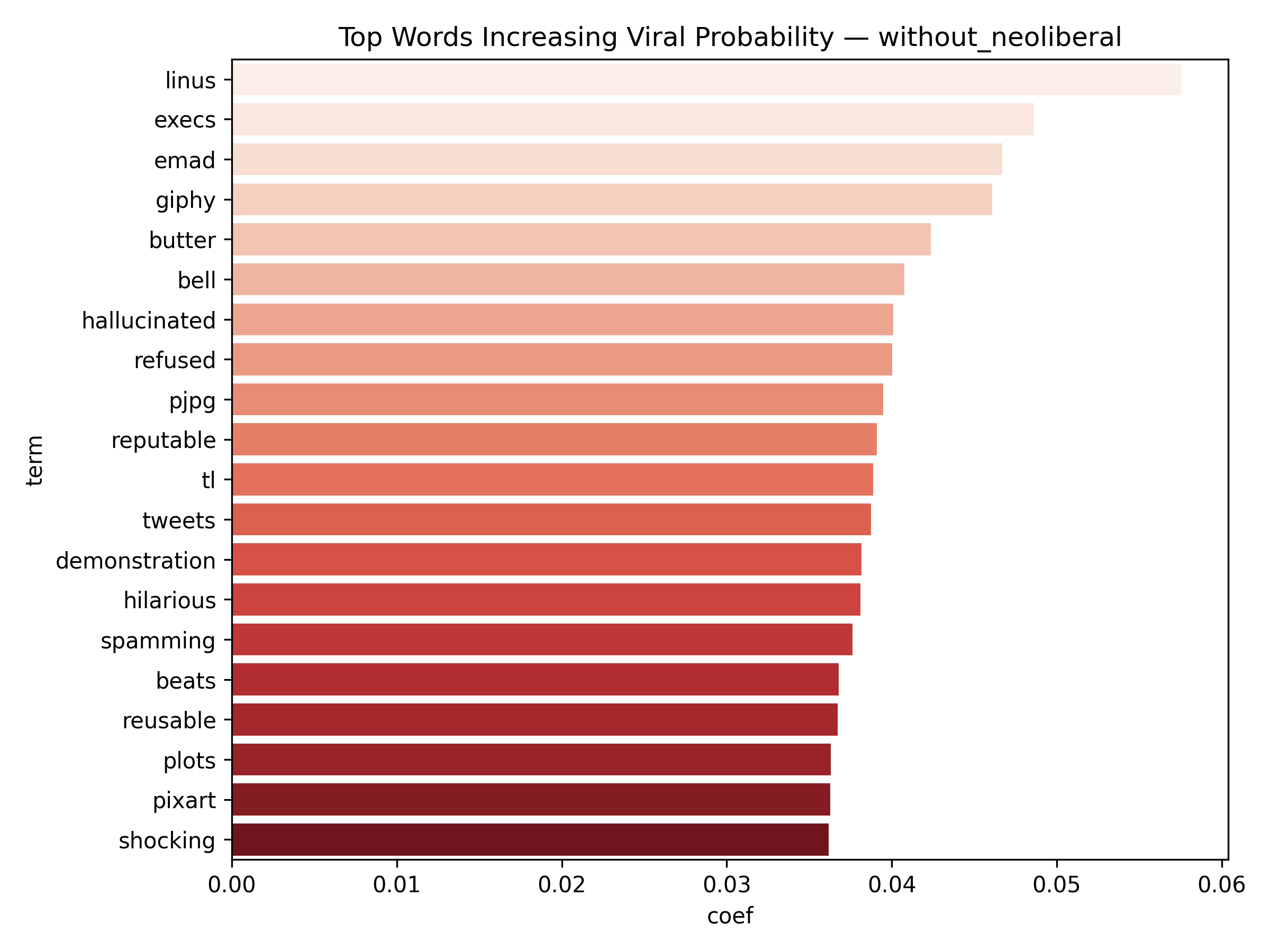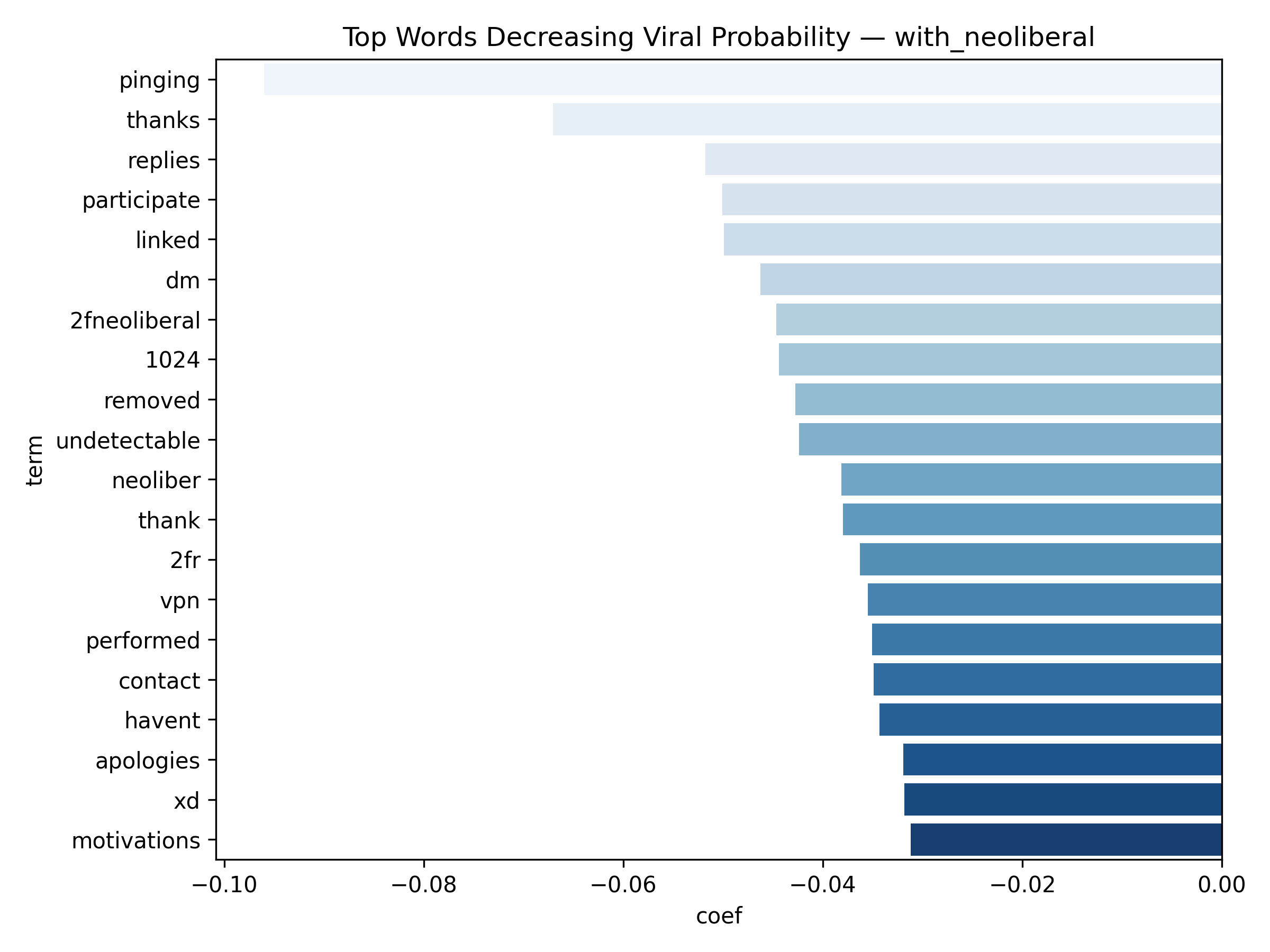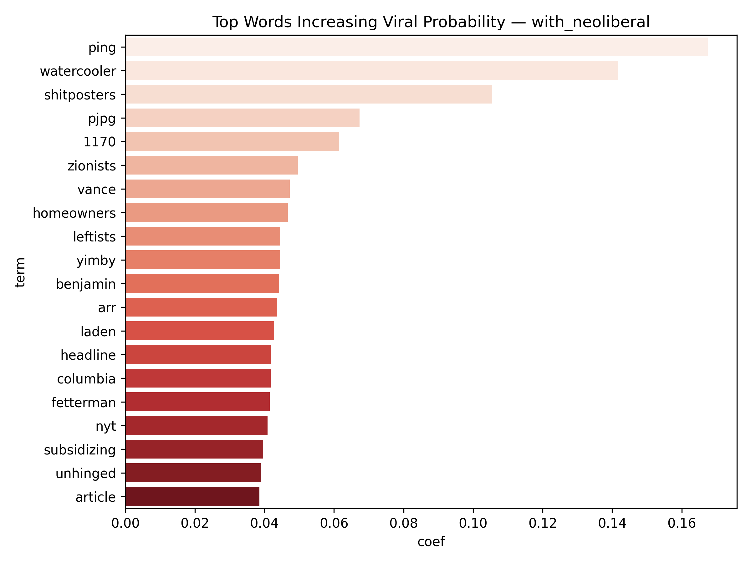 Binary classification for viral prediction demonstrated stronger performance than score regression. Using a threshold of score > 9, models achieved: ROC-AUC of 0.67, PR-AUC of 0.30 (with neoliberal) / 0.19 (without), Accuracy of 83.5% (with) / 88.3% (without), and F1 scores of 0.76 (with) / 0.83 (without). The without-neoliberal model performed better due to reduced noise from politically-focused content. Logistic regression coefficients revealed linguistic markers of viral content. Words associated with higher virality include specific technical terms, actionable advice, and surprising insights. Words associated with lower engagement include vague expressions, complaint-focused language, and overly general statements. The model demonstrates that viral prediction is more tractable than exact score prediction, as it captures threshold-crossing patterns rather than granular engagement levels.