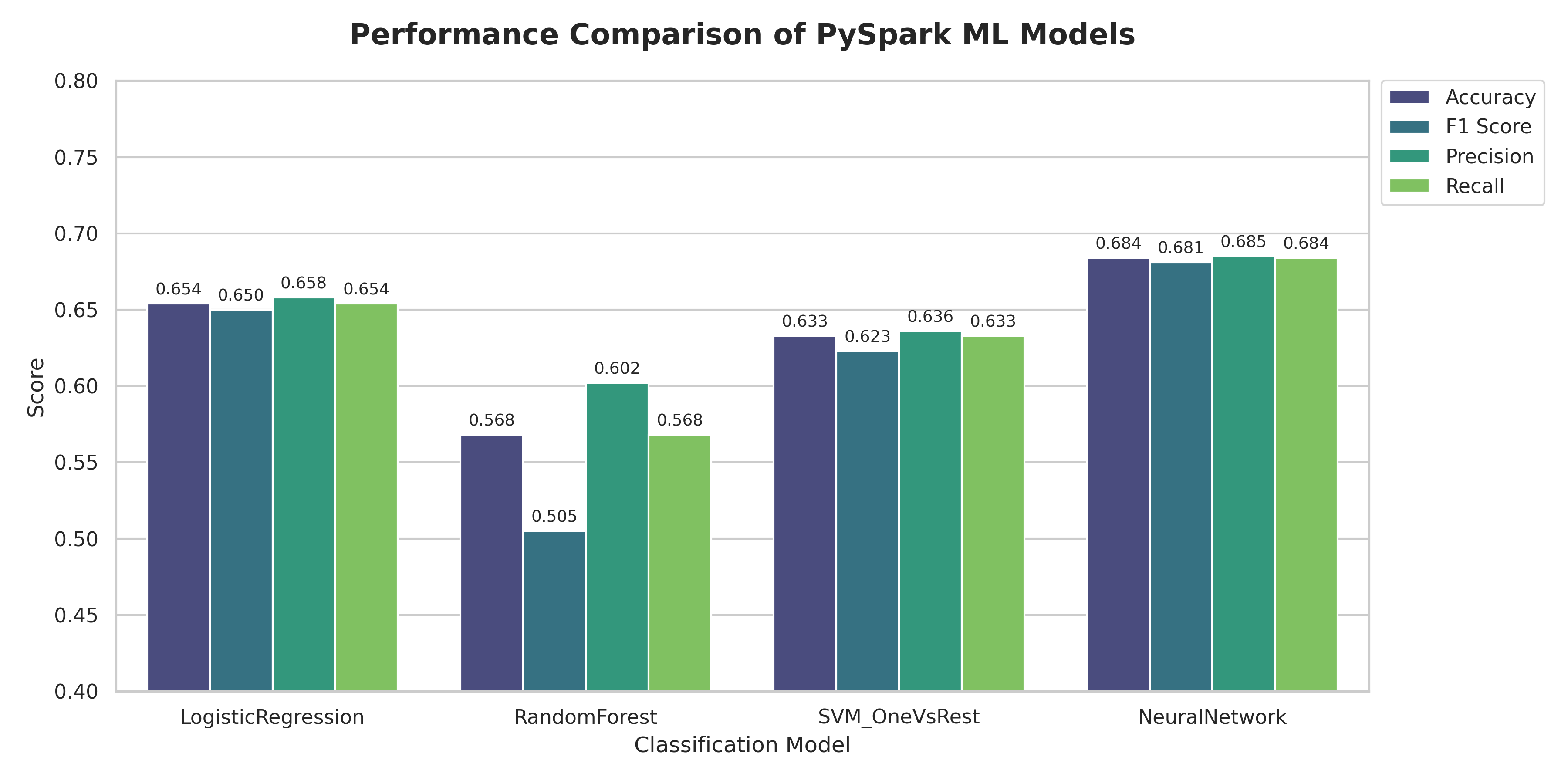 - SVM (OneVsRest): LinearSVC wrapped with OneVsRest for multi-class support (maxIter=10)