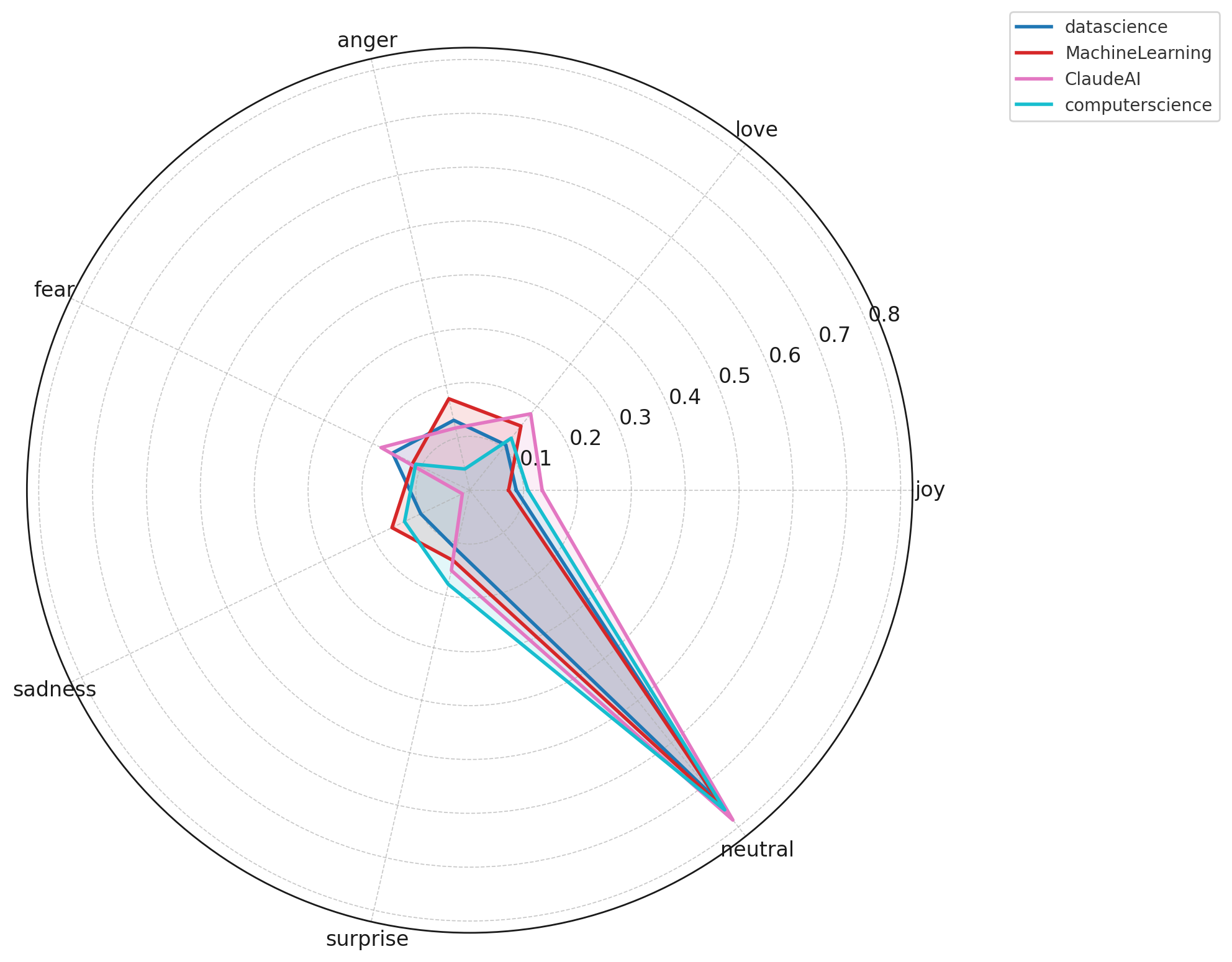 Subreddits such as MachineLearning, datascience, programming, and LocalLLaMA exhibit minimal joy, fear, anger, or sadness. Conversations remain focused on debugging, implementation, and model performance rather than personal feelings.Creative AI communities express more emotional variability.