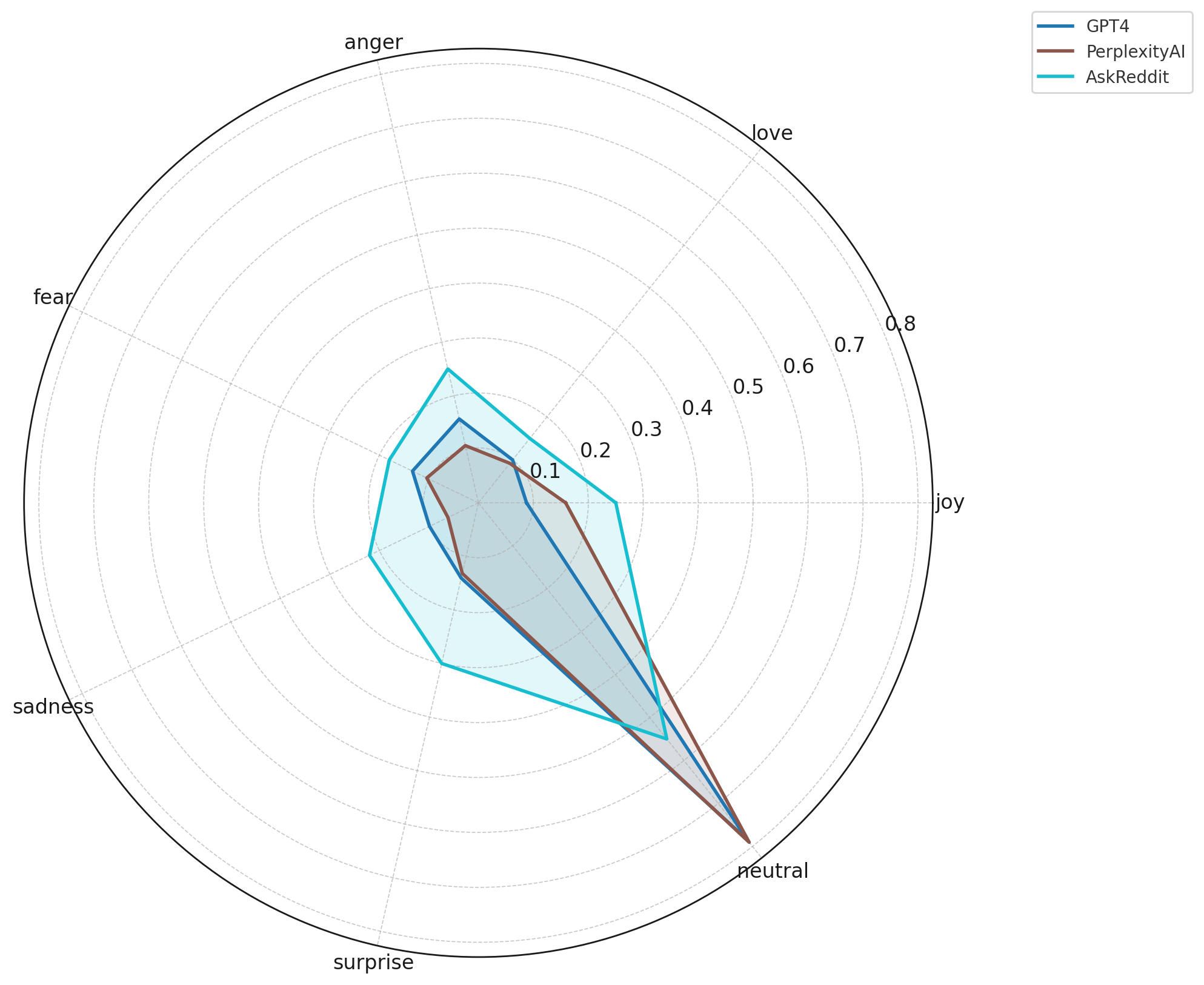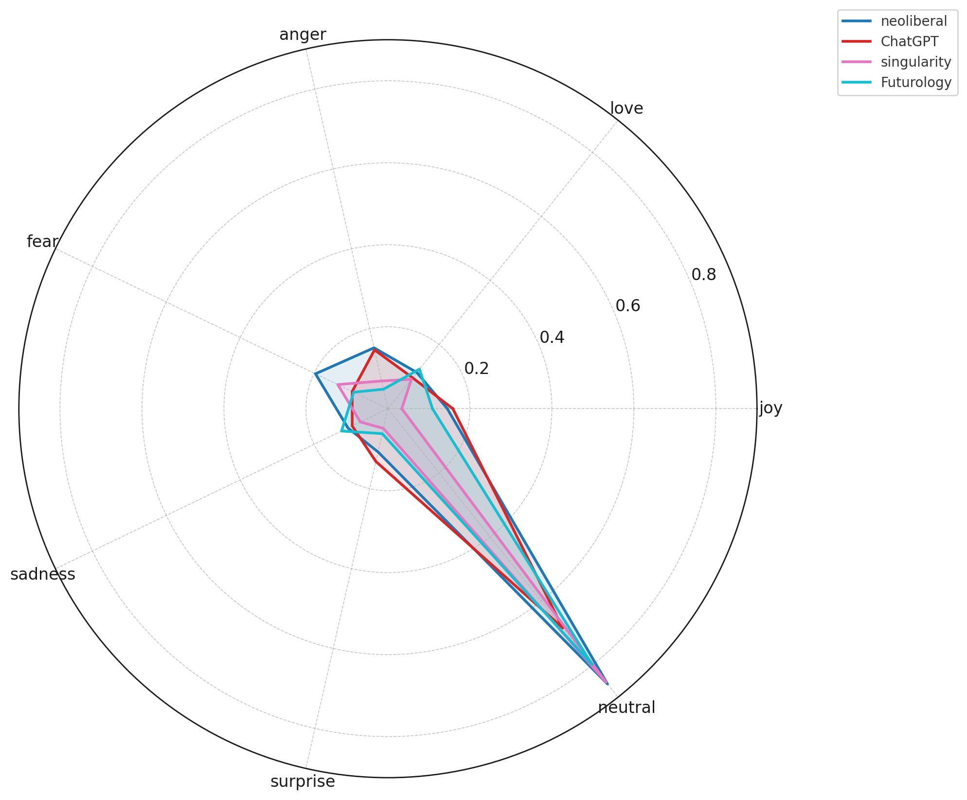 Communities like Futurology, singularity, and neoliberal express more fear, sadness, and anger, reflecting societal, economic, and existential anxieties around AI rather than purely technical concerns.AskReddit is the most emotionally expressive baseline.