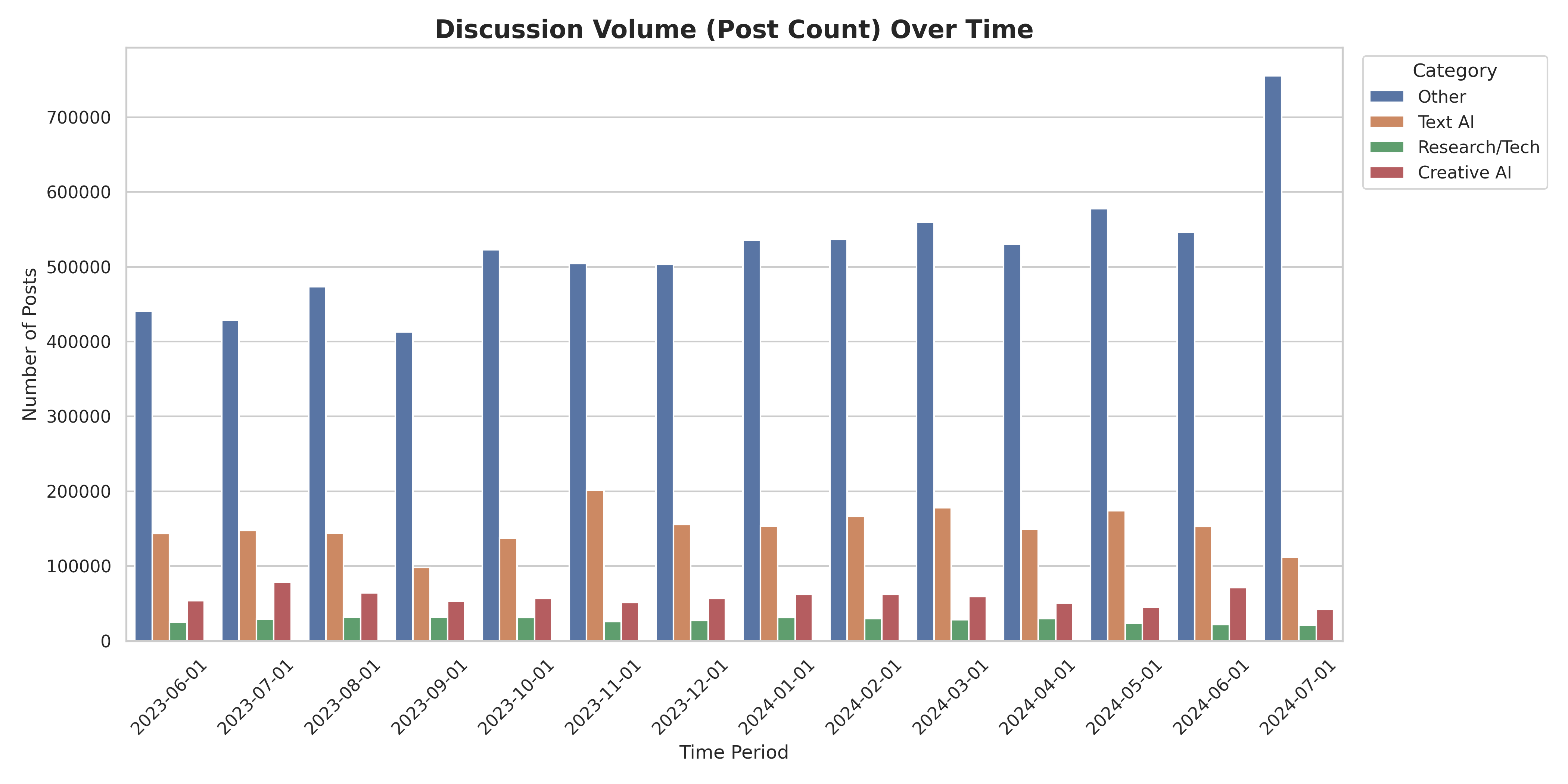 Lexicon-based sentiment analysis from June 2023 to June 2024 reveals distinct patterns across AI tool categories. Creative AI tools maintain the highest positive sentiment (0.20-0.27), with users expressing more positive language when discussing image generation tools compared to text-based alternatives. Text AI tools show high volatility (0.03-0.13), with sentiment spiking around major model releases (e.g., 0.13 in October 2023) then normalizing as users encounter practical limitations. Research/Tech subreddits show declining sentiment, dropping from 0.21 (July 2023) to 0.09 (June 2024), suggesting growing concerns in technical communities. Temporal analysis reveals clear hype cycles: sentiment peaks coincide with major releases but return to baseline within 2-4 weeks, indicating that initial excitement gives way to practical usage concerns. Notably, all AI-specific categories show positive sentiment, while general AskReddit content maintains negative sentiment (-0.045 to -0.01), highlighting that AI discussions carry distinct emotional tones combining both excitement and concerns.