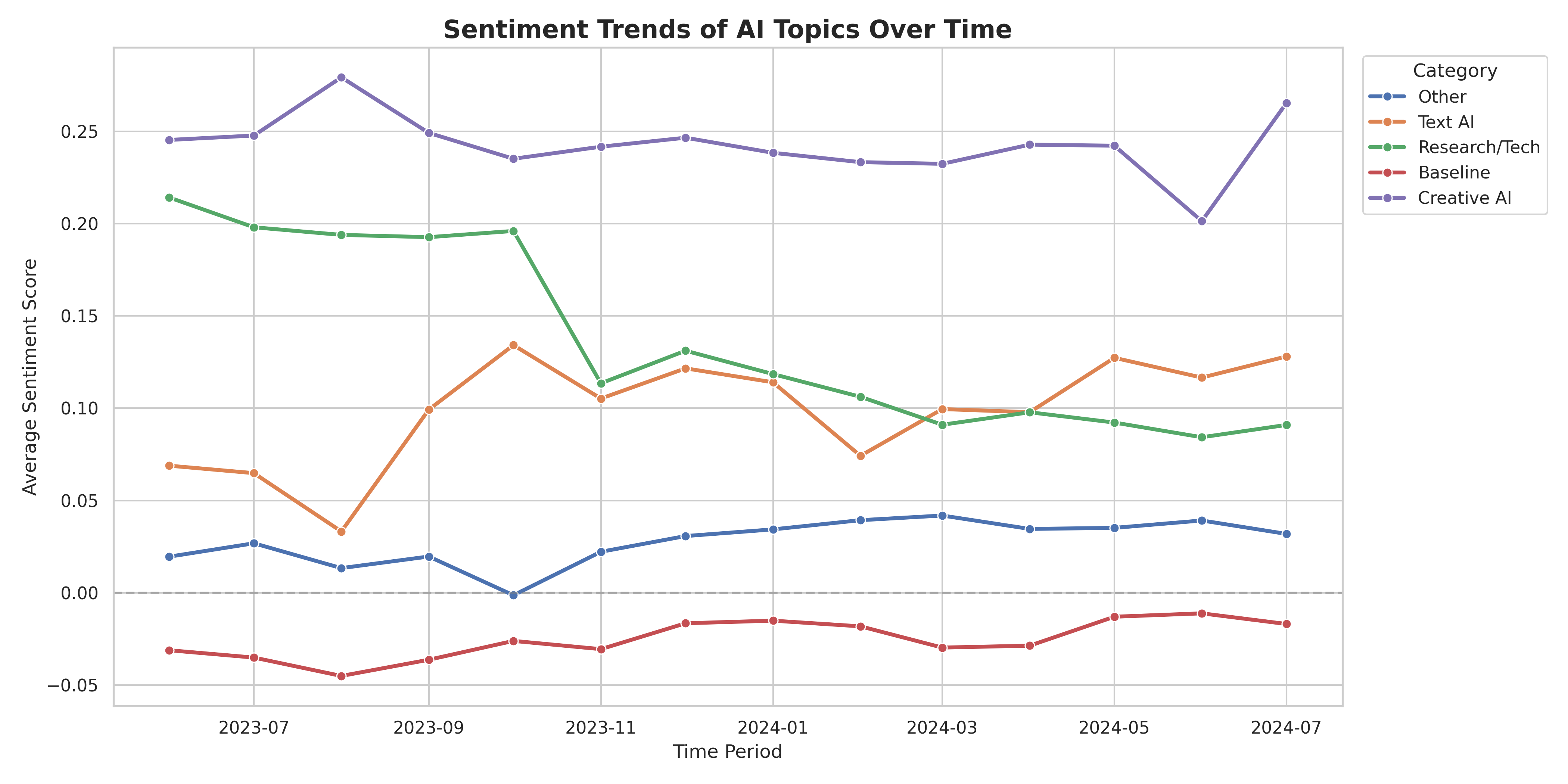 Creative AI maintains the highest positive sentiment (0.20-0.27), significantly outperforming Text AI (0.03-0.13) and Research/Tech (0.09-0.21). Users have more positive wordings when discussing about image generation tools than text-based AI.