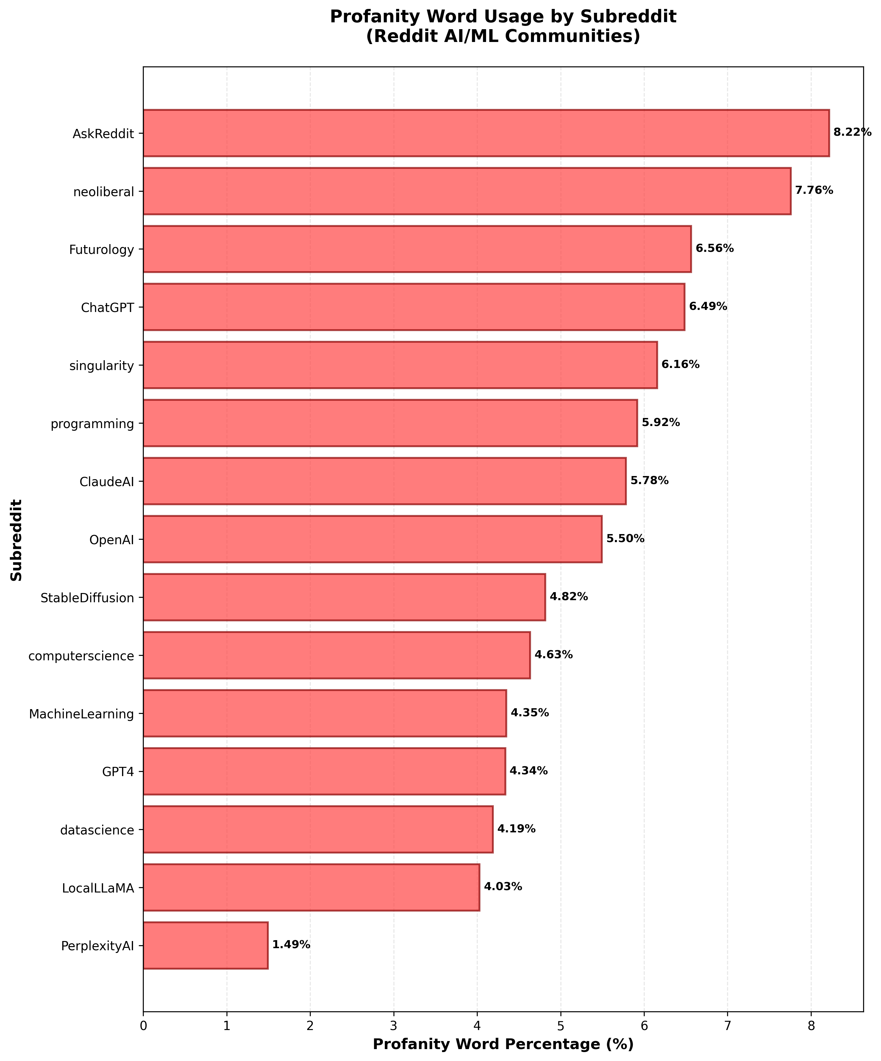 The bar chart showcase this pattern: AskReddit leads with the highest profanity percentage (8.22%), followed by neoliberal (7.76%) and Futurology (6.56%), signaling more emotionally charged or socially polarized conversations. Meanwhile, subreddits focused on engineering or research- such as datascience, GPT4, MachineLearning, and computerscience - show lower profanity levels (4–4.6%). PerplexityAI, notably, has the lowest rate (1.49%), indicating highly utility-driven, information-focused discussions with minimal emotional or toxic language. Overall, the results show a clear divide between general-audience or debate-oriented communities and technical AI research communities in terms of emotional tone and toxicity.