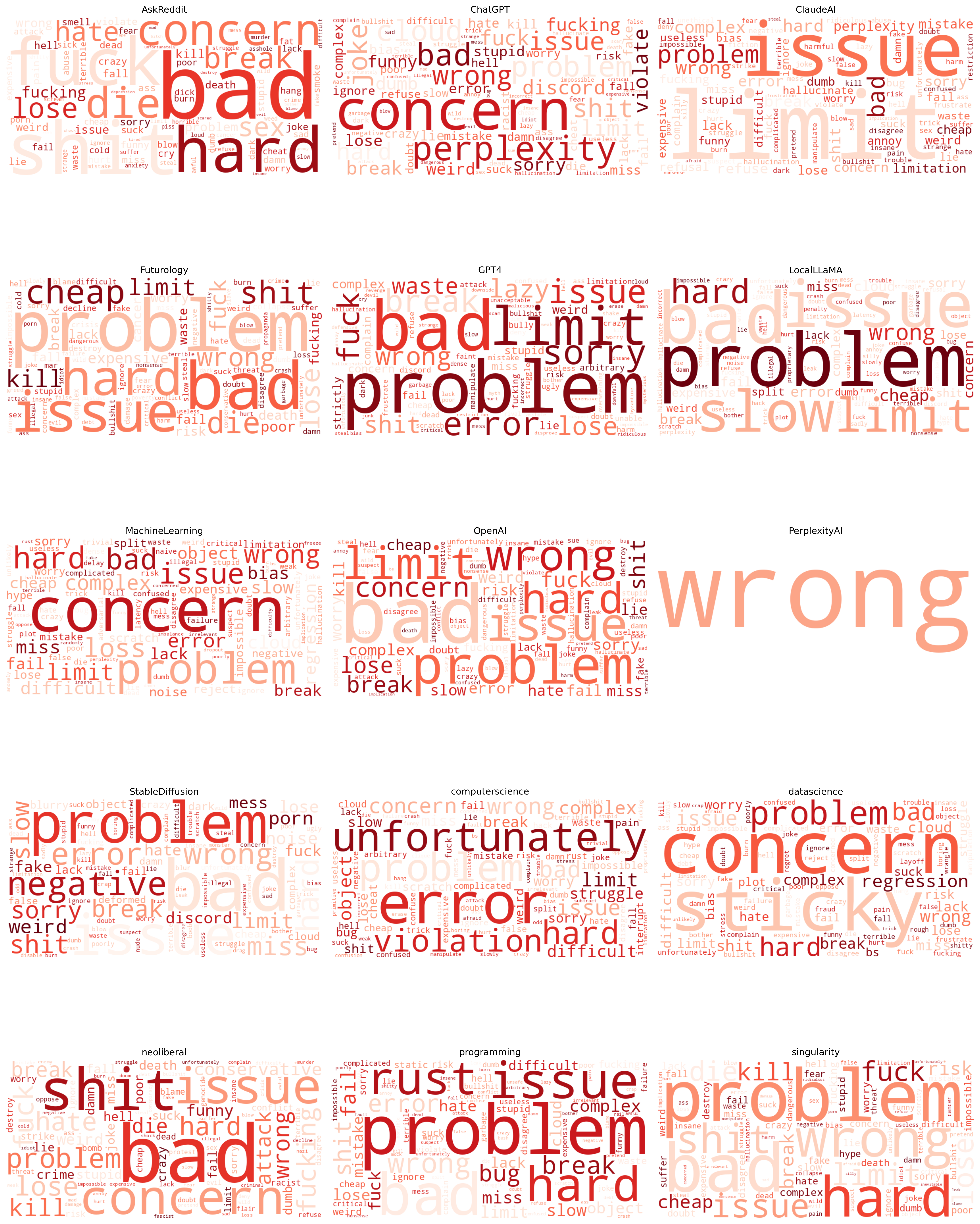 Across the word clouds, the most prominent terms, such as “problem,” “issue,” “error,” “wrong,” “concern,” “hard,” “limit,” and “bad”, indicate that discussions across AI-related subreddits are heavily anchored in frustrations, feature limitations, and technical challenges. These words dominate nearly every community, suggesting a shared pattern: users frequently describe difficulties with AI tools, unexpected behaviors, performance failures, and constraints that hinder workflows. Even in non-technical subreddits, terms like “concern,” “violation,” and “unfortunately” show that sentiment tends toward reporting negative experiences or dissatisfaction.