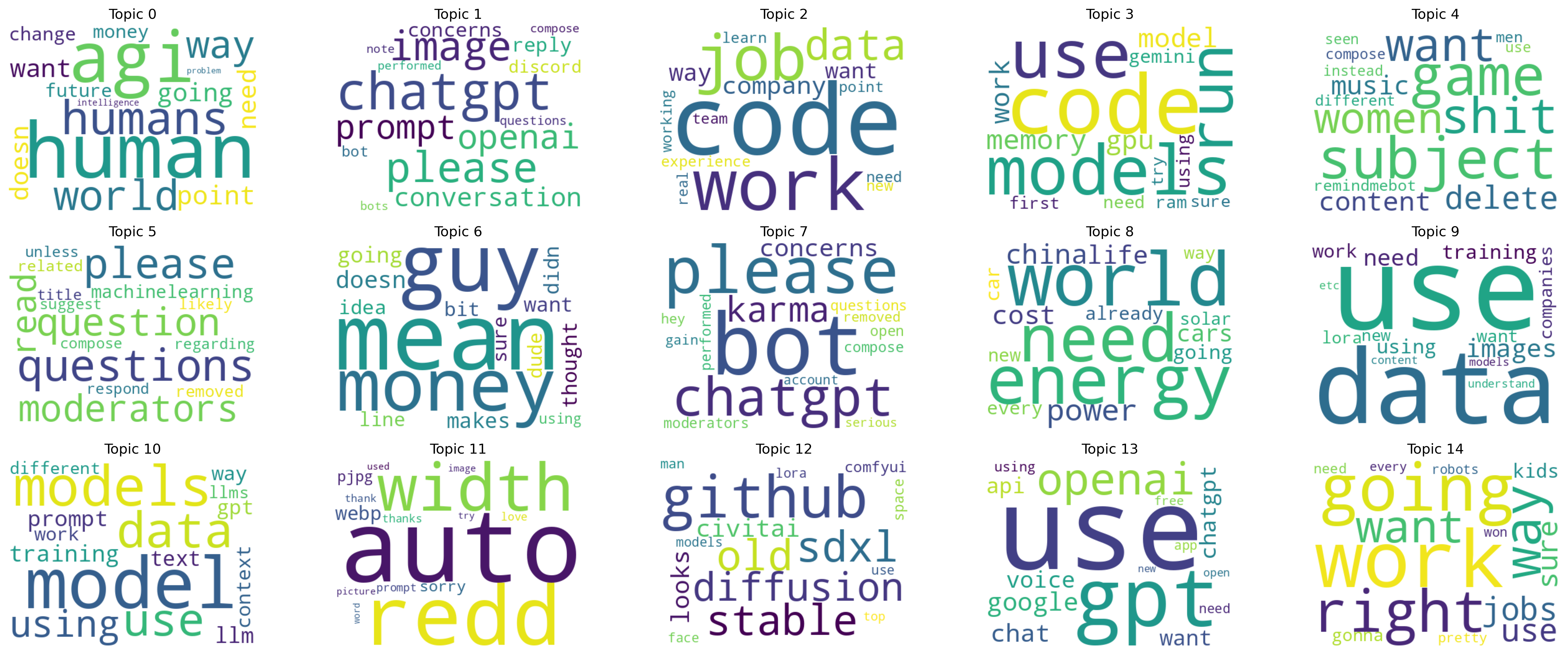 Topics 0, 1, 3, 8, and 10 capture conversations about running LLMs, writing code, handling data workflows, troubleshooting errors, and generating images or art. These discussions remain core across both models, representing the practical side of AI participation on Reddit.