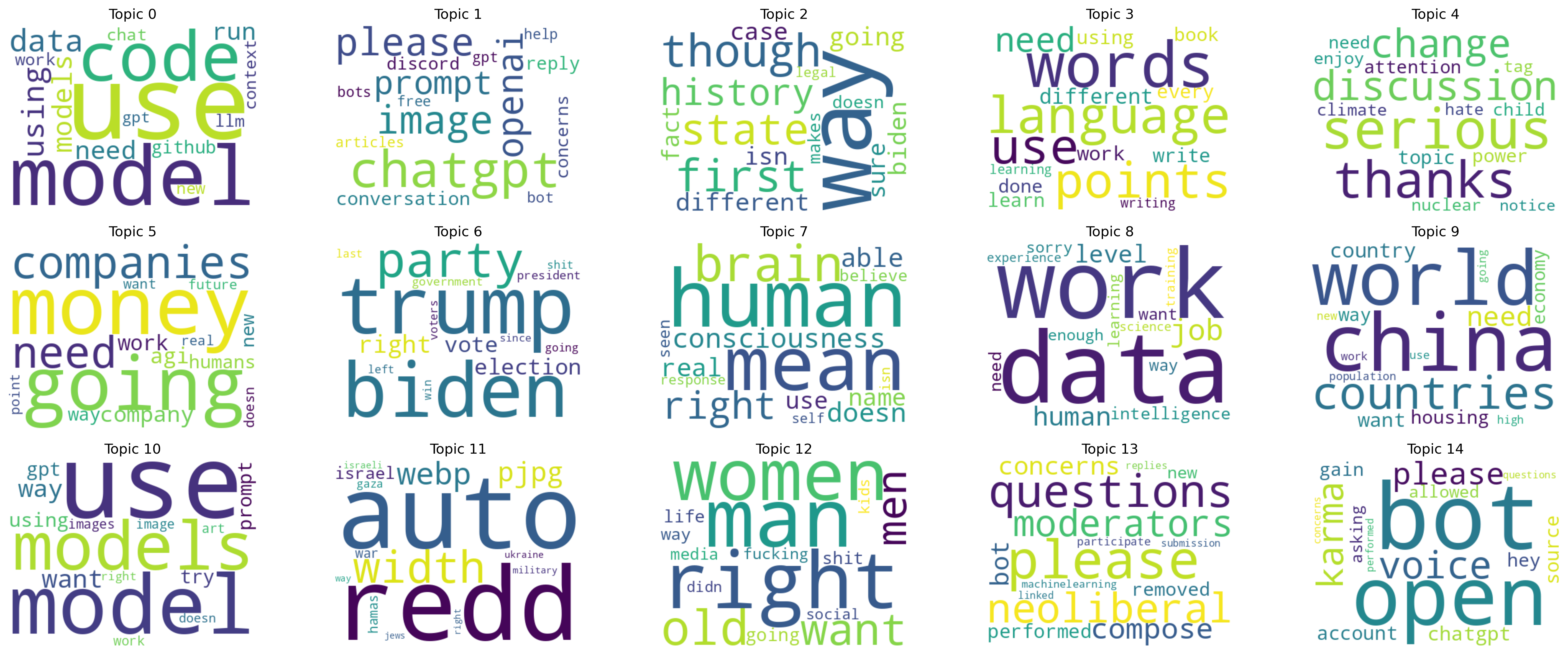 This produces interpretable topic structures that reflect key themes in AI-related discussions.